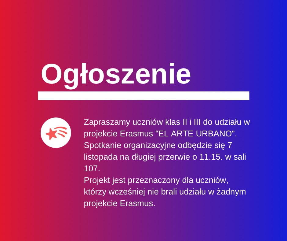 Zapraszamy uczniów klas II i III do udziału w projekcie Erasmus "EL ARTE URBANO".