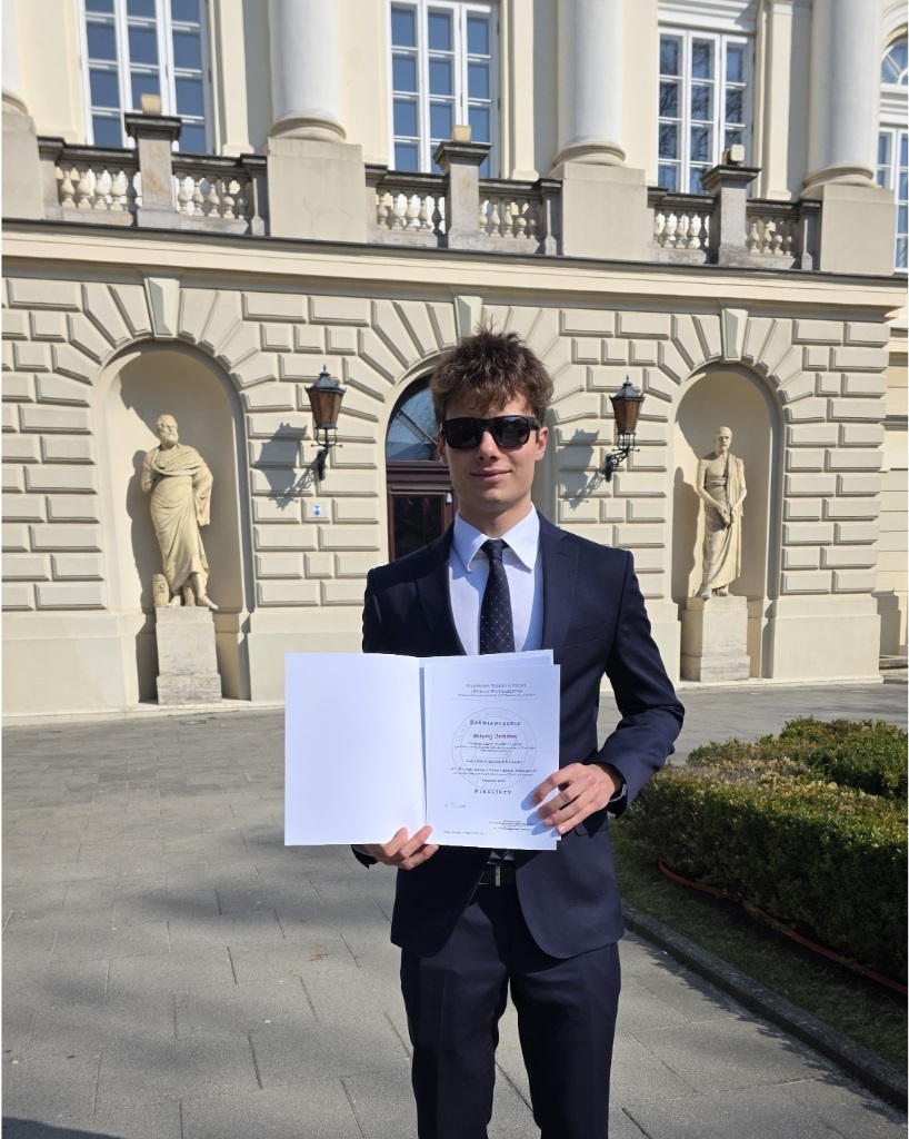 1. Olimpiady Wiedzy o Polsce i Świecie Współczesnym, uzyskał w niej tytuł finalisty co daje mu 100 procent na maturze z WOSu oraz ułatwienia w rekrutacji na topowe uczelnie w Polsce (UJ czy UW). Finał odbywał się w Warszawie na Uniwersytecie Warszawskim 28 marca a organizatorzy zapewnili również wstęp do Pałacu Prezydenckiego.