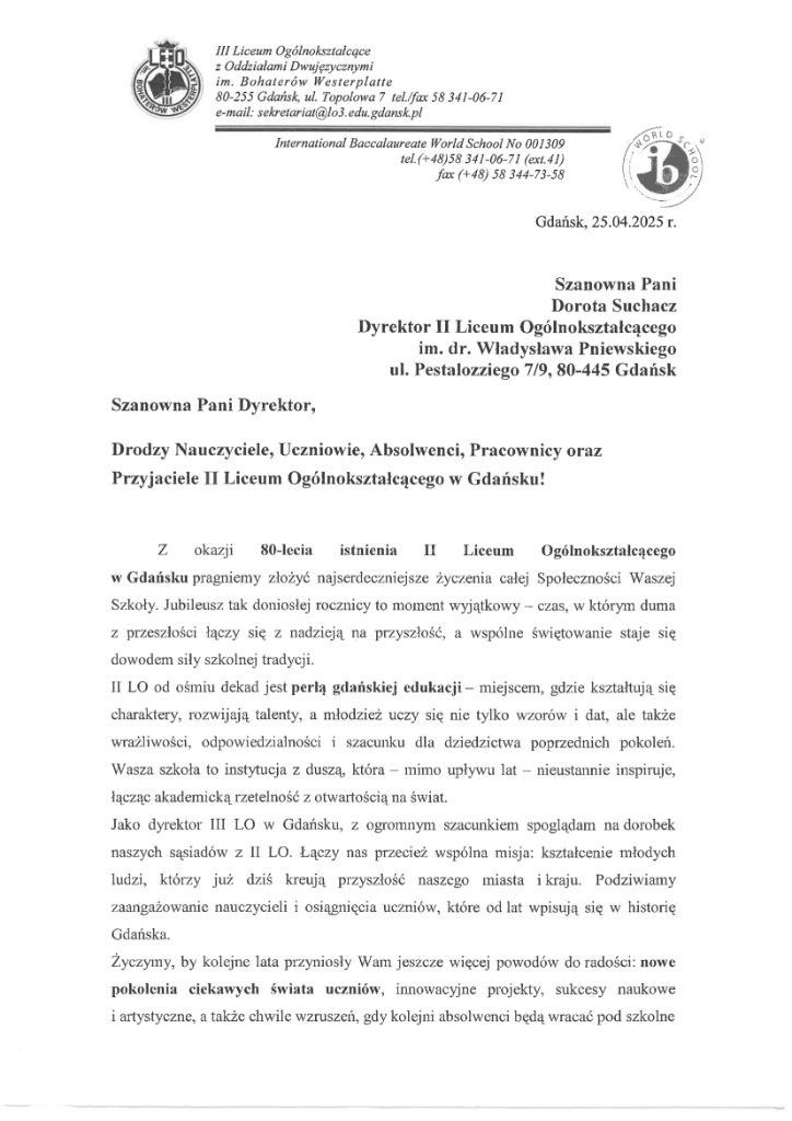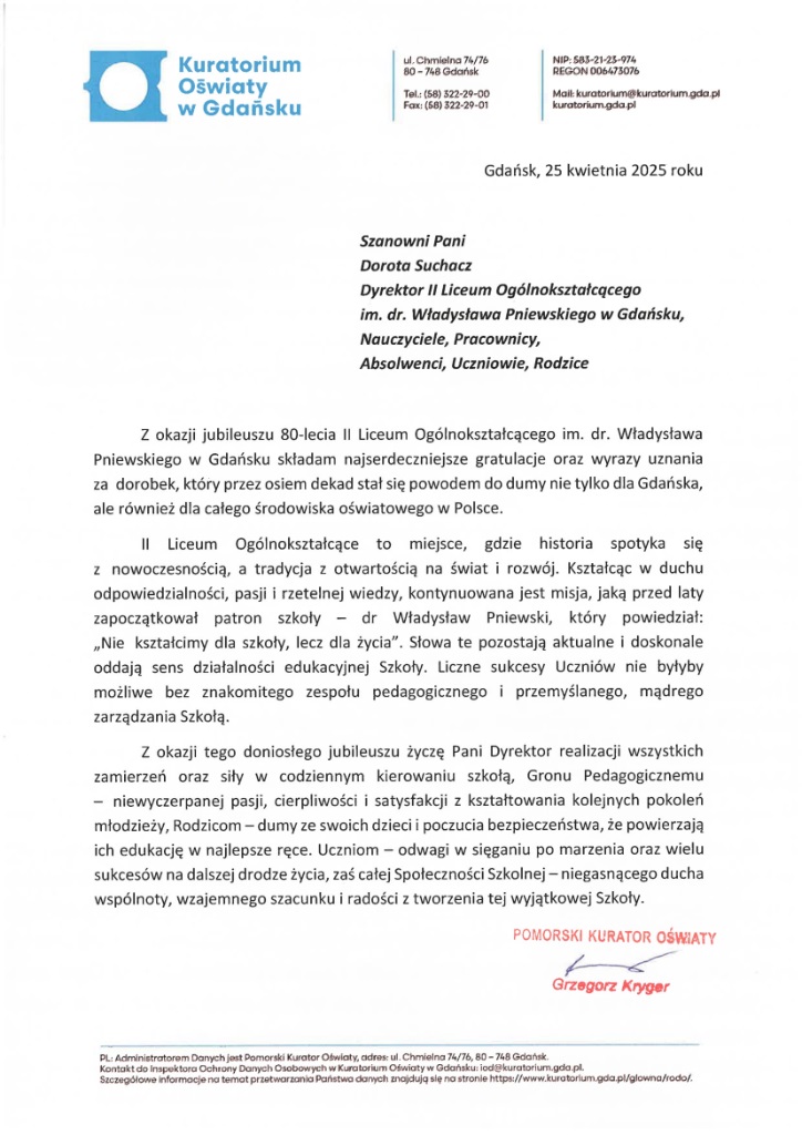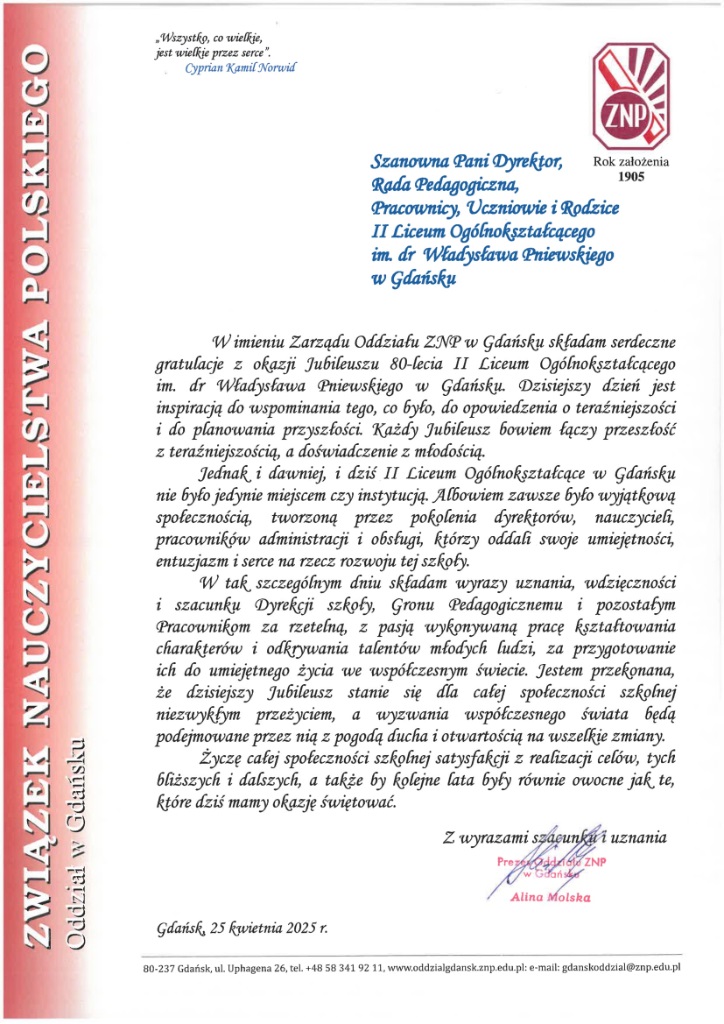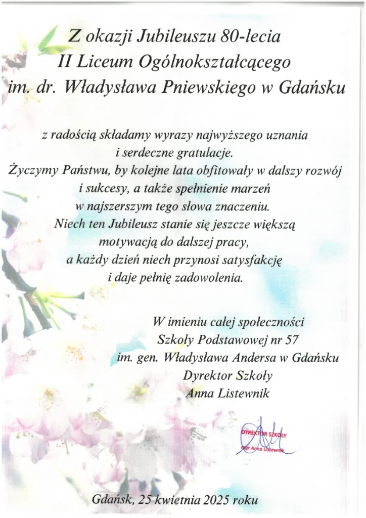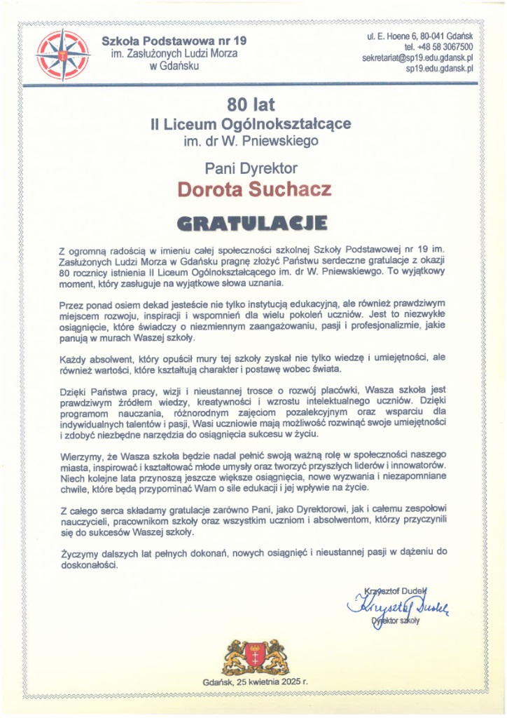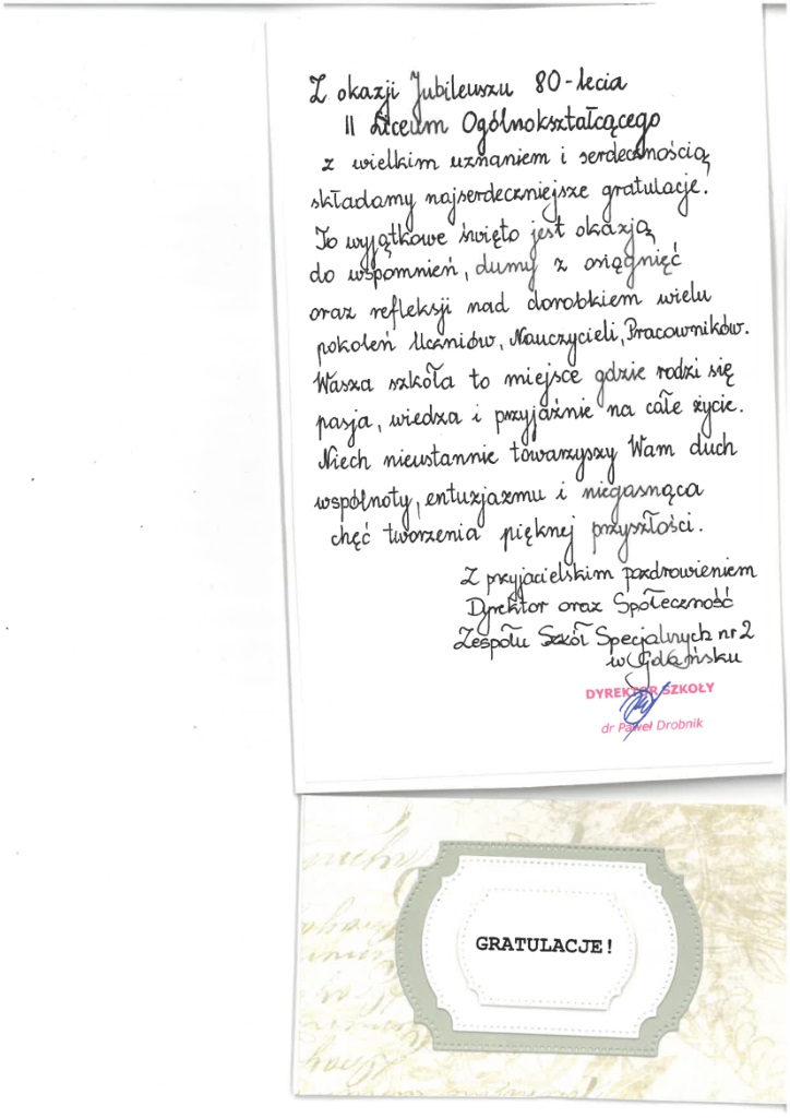 Gratulacje i życzenia z okazji Jubileuszu 80-lecia - II Liceum Ogólnokształcące im. dr. Władysława Pniewskiego