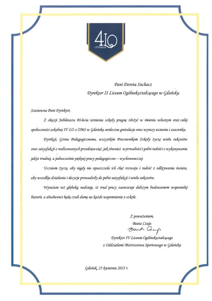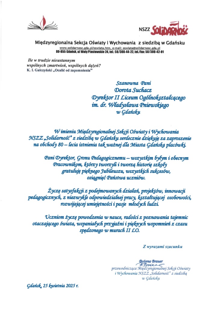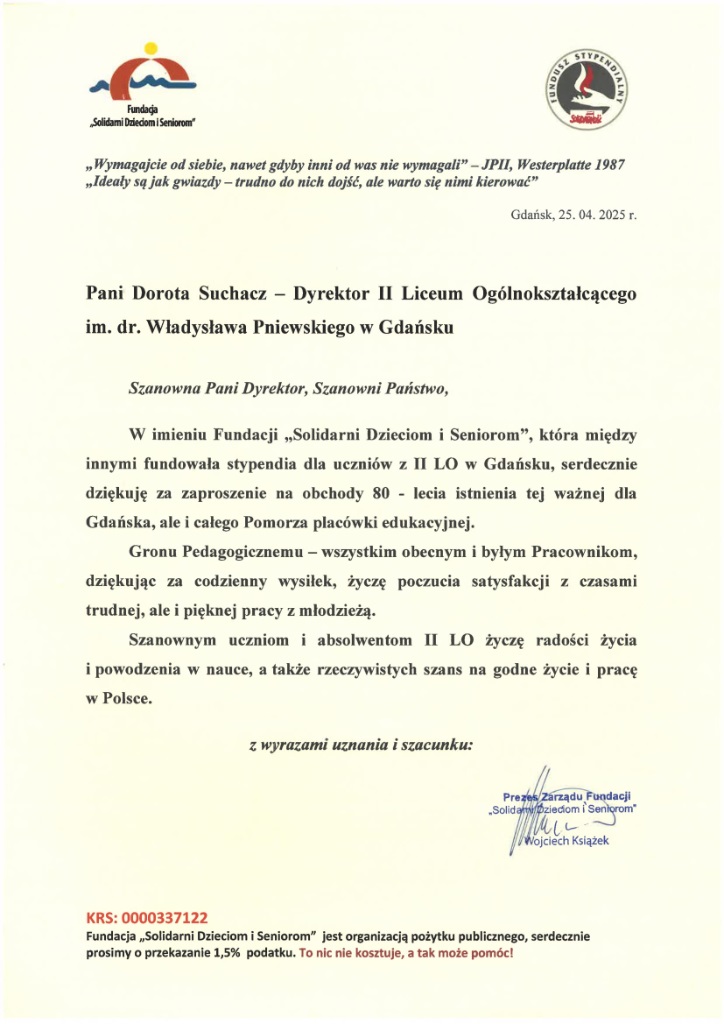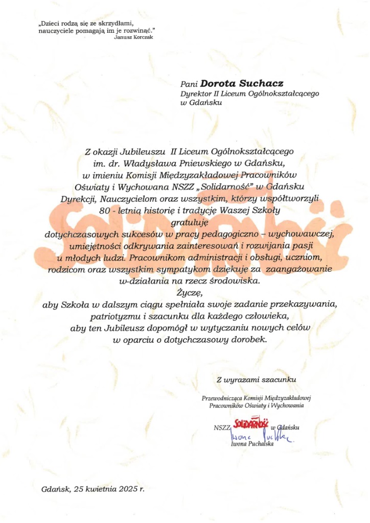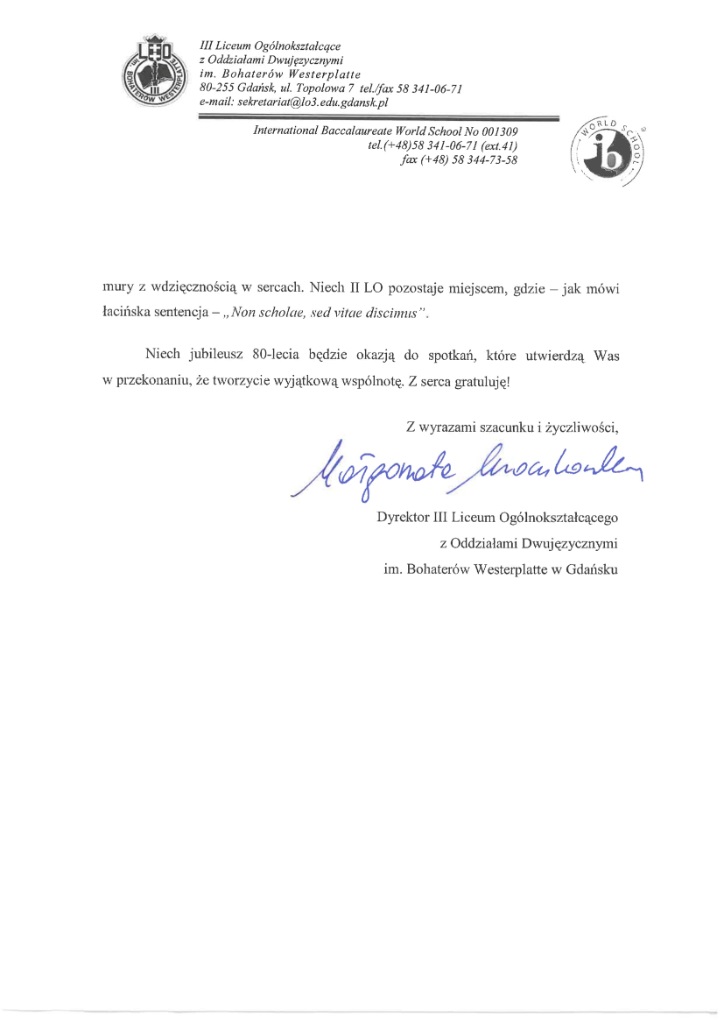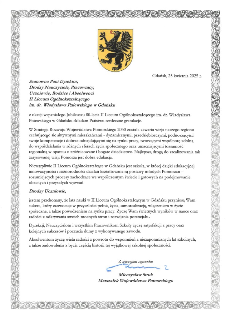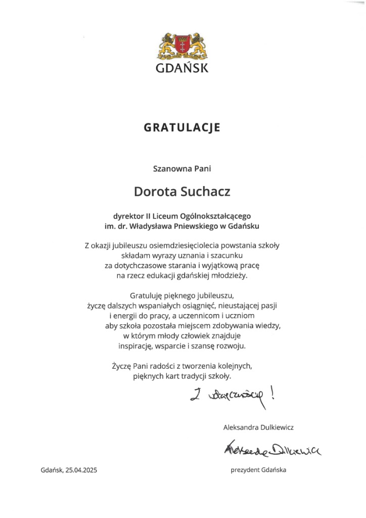 Gratulacje i życzenia z okazji Jubileuszu 80-lecia - II Liceum Ogólnokształcące im. dr. Władysława Pniewskiego